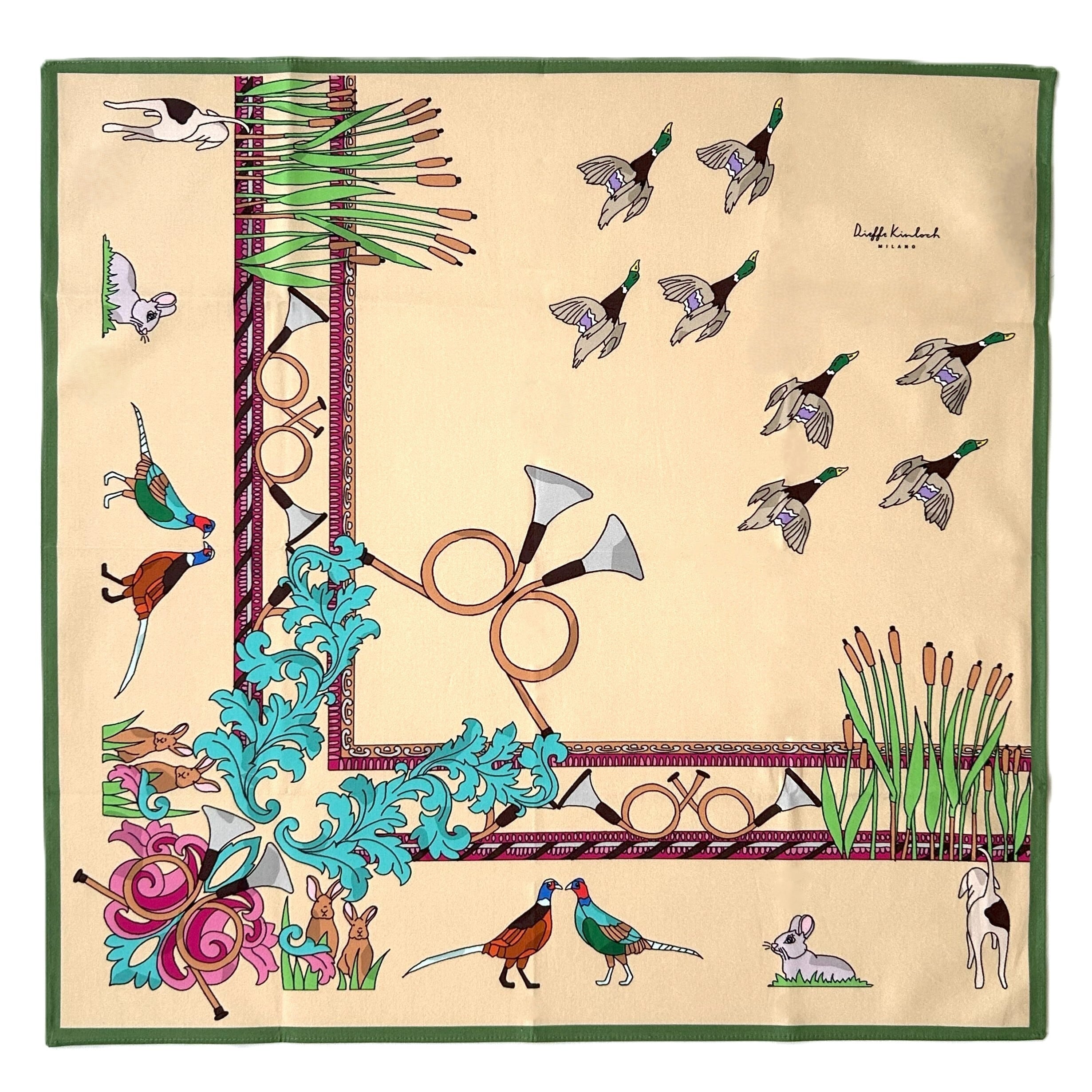 猟で合図を送る際に使われていたと言うCACCIAと様々な動物たちが描かれた、ユニークなデザインが特徴のハンカチ。