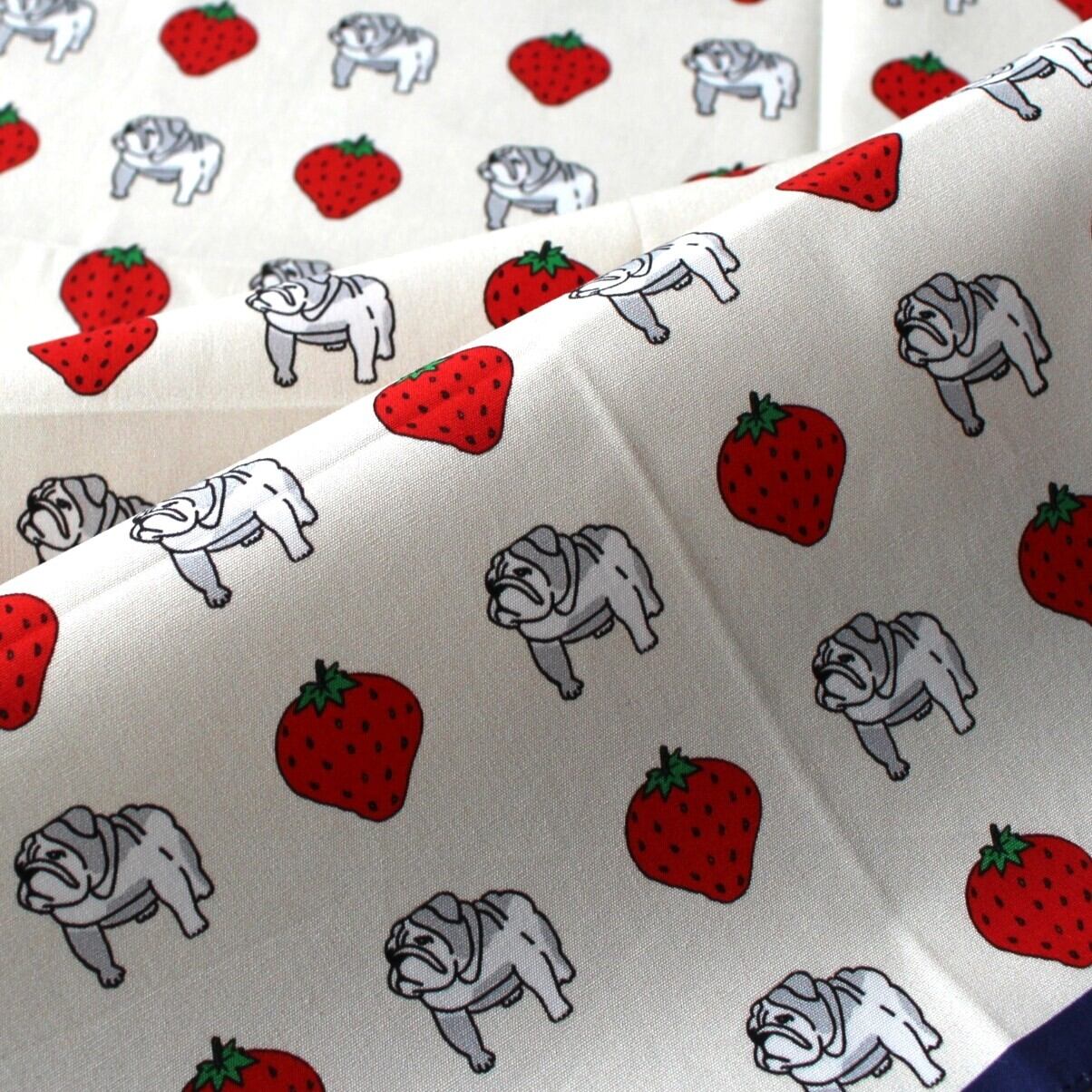 ブルドッグといちごをモチーフにしたユニークなデザインが特徴のハンカチ。